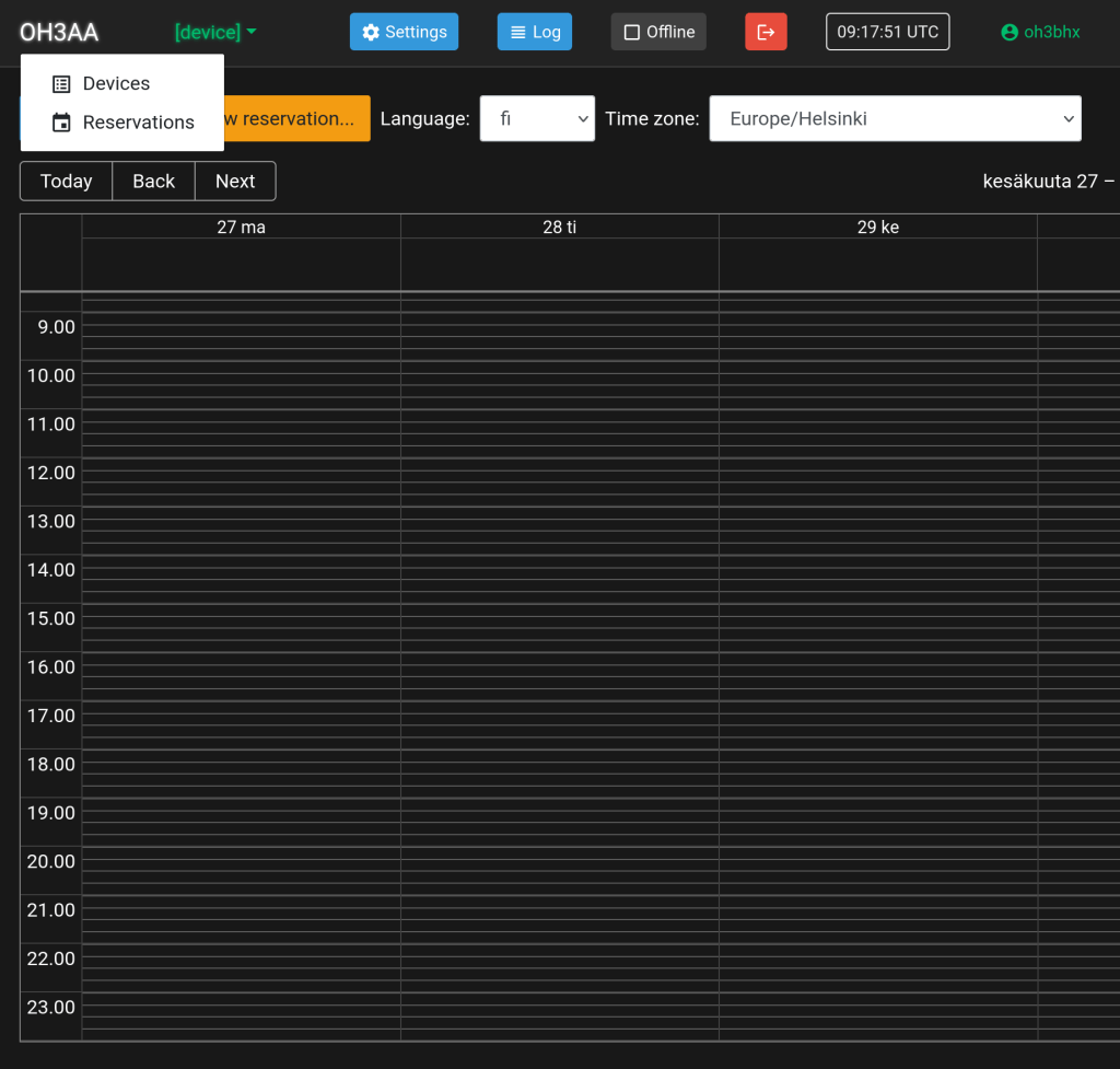 Varauskalenteria voi tarkastella klikkaamalla vasemman yläkulman OH3AA-kutsua, josta aukeaa valikko. Valitse valikosta ”Reservations” tarkastellaksesi varauskalenteria.