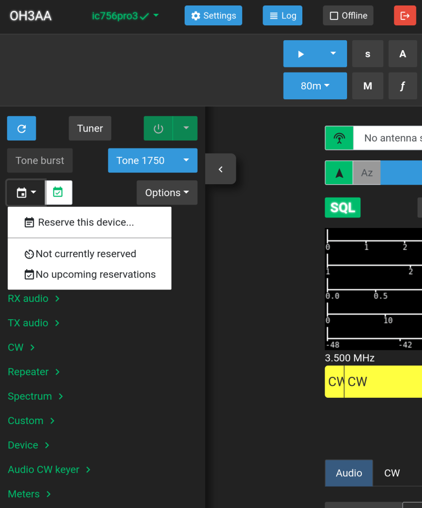 Aseman radion varaus tapahtuu radion ohjausnäkymässä (IC-756Pro3) vasemmasta sivupalkista klikkaamalla kalenteri-kuvaketta. Kuvakkeesta aukeaa valikko, josta valitaan ”Reserve this device…”: